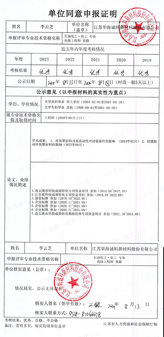 關(guān)于推薦江蘇華海誠科新材料股份有限公司李云芝同志申報化工工程高級工程師職稱的公示