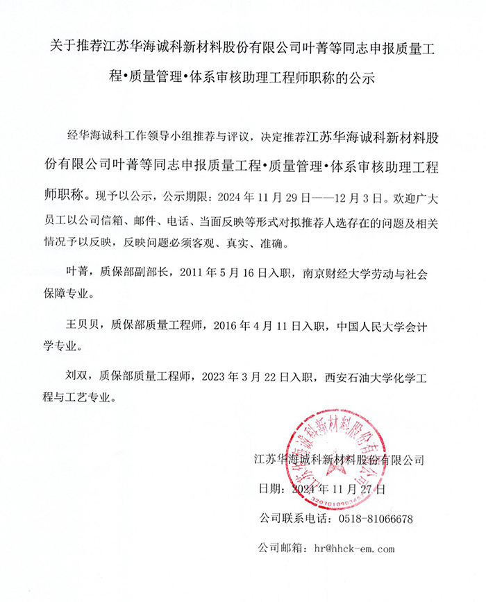 經(jīng)華海誠(chéng)科工作領(lǐng)導(dǎo)小組推薦與評(píng)議,決定推薦江蘇華海誠(chéng)科新材料股份有限公司葉菁等同志申報(bào)質(zhì)量工程?質(zhì)量管理?體系審核助理工程師職稱。現(xiàn)予以公示,公示期限:2024年11月29日——12月3日。歡迎廣大員工以公司信箱、郵件、電話、當(dāng)面反映等形式對(duì)擬推薦人選存在的問(wèn)題及相關(guān)情況予以反映,反映問(wèn)題必須客觀、真實(shí)、準(zhǔn)確。